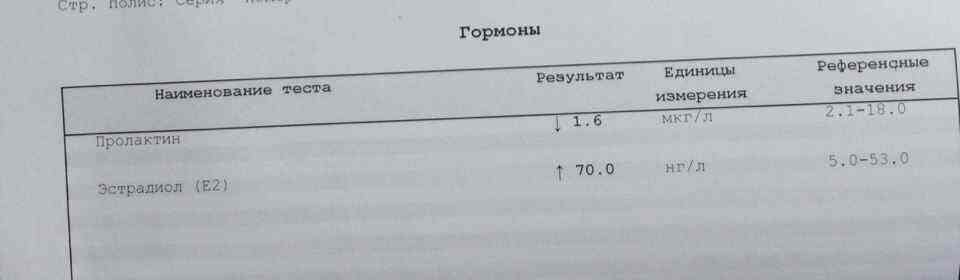 сегодняшние : Е2 70.0 норма 5.0 -53.0, пролактин 1.6 норма 2.1-18.0