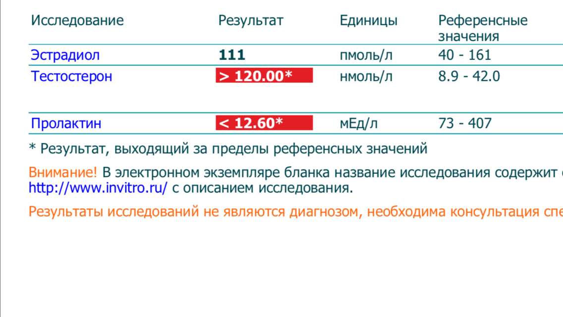 Эстрадиол 73 пмоль/л 40 - 161 пмоль/л Тестостерон 13.90 нмоль/л 8.9 - 42.0 нмоль/л Нижний диагностический порог, рекомендованный ISSAM: 12 нмоль/л Пролактин 147 мЕд/л 73 - 407 мЕд