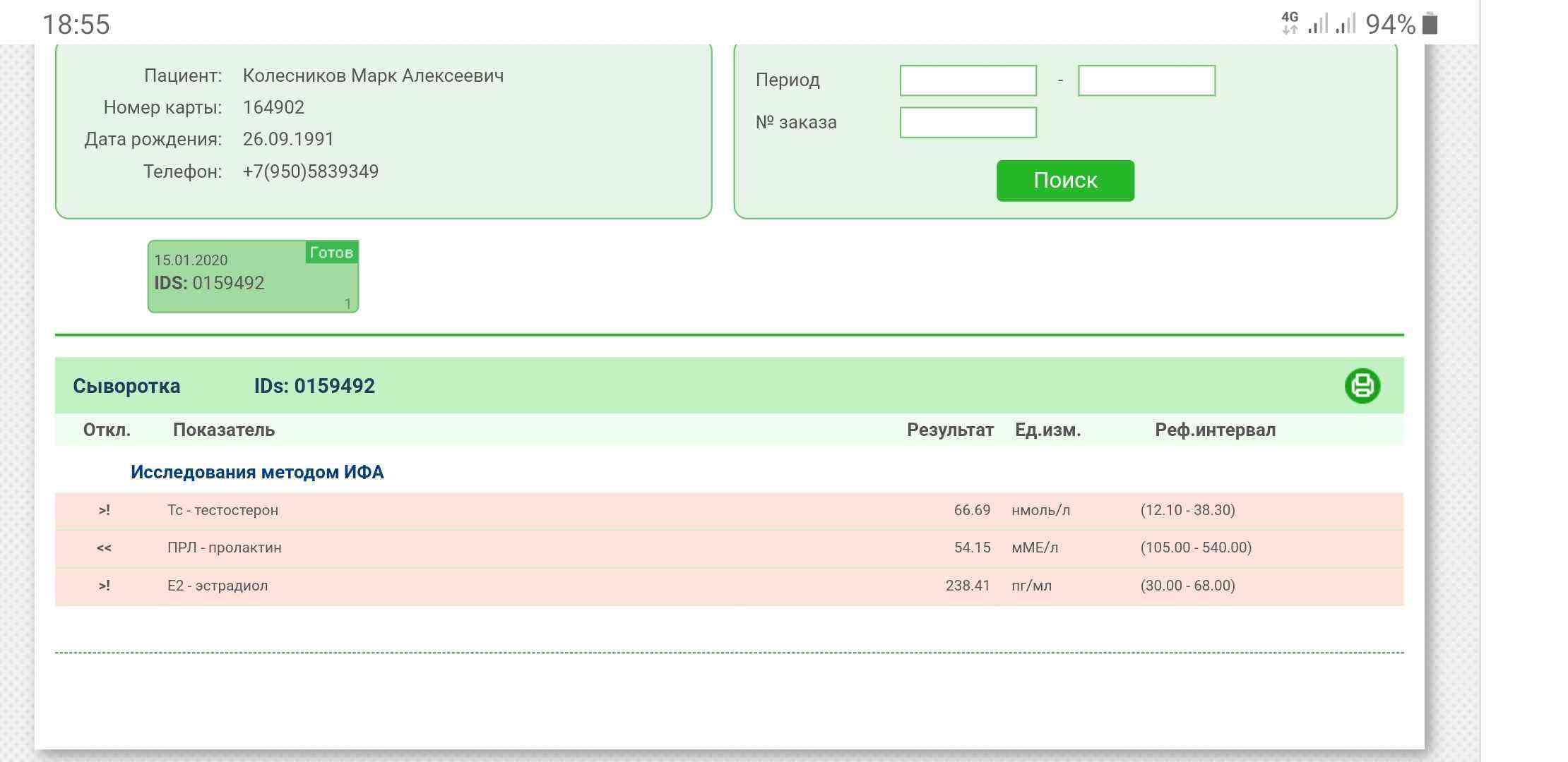 @bobtest, пролактин нужно заонять в рефы, и пересдавать тестостерон. 13.8 не много, должен подрасти, если ПРЛ в рефы загнать