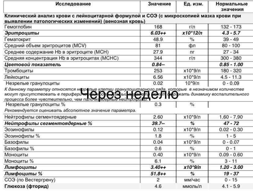то что лимфоциты и эритроциты увеличились за неделю это норма?Всё нормально идёт. Видно, что недавно переболел. Не переживай.