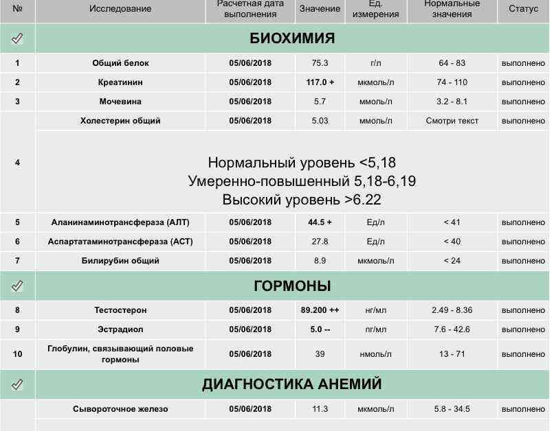 | Исследование | Результат | Предыдущий результат | Референсные значения |