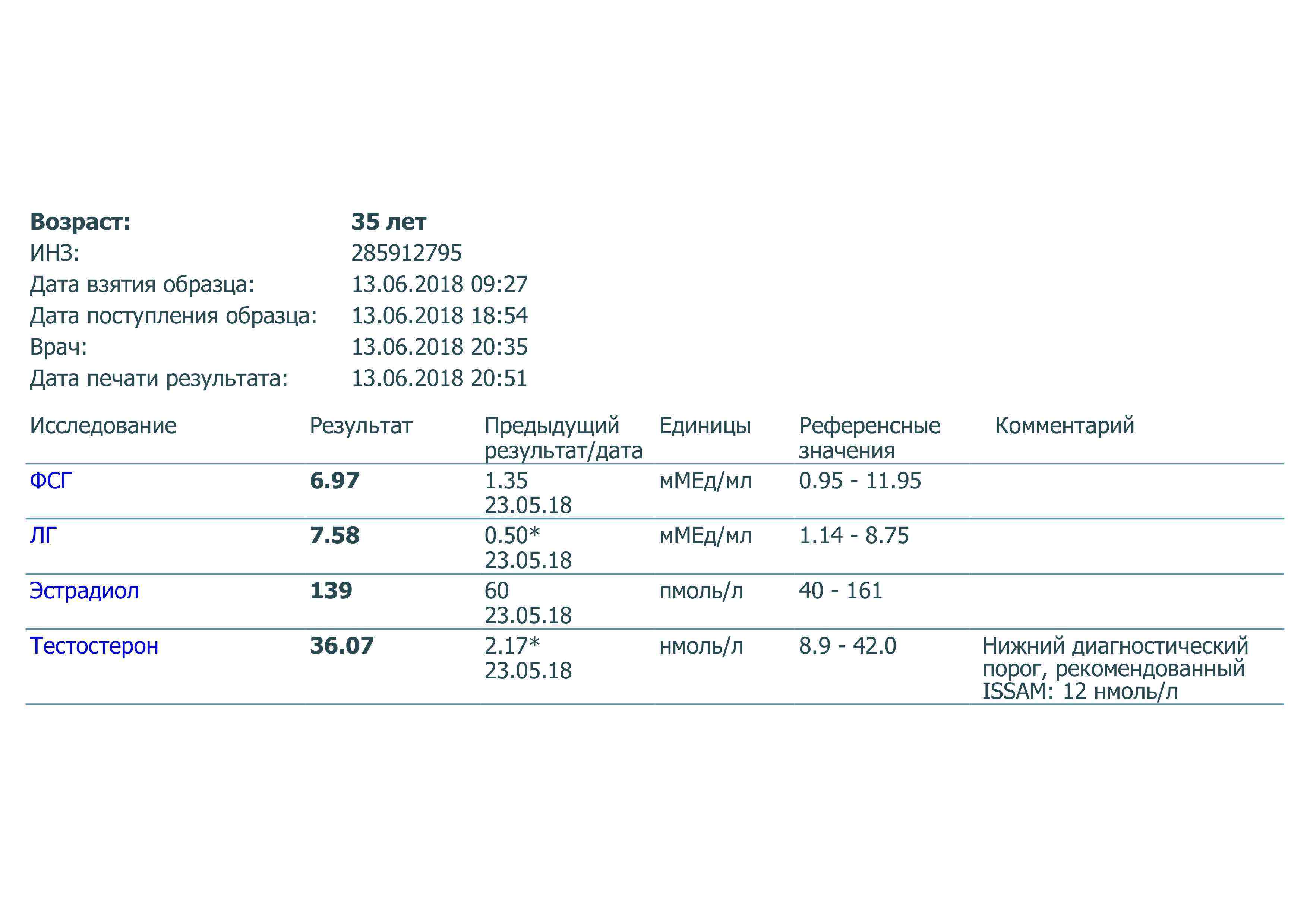 Исследование Результат Предыдущий результат Референсные значения ФСГ 3,71 мМЕд/мл 0.95 - 11.95 мМЕд/мл ЛГ 7.58 мМЕд/мл 1.14 - 8.75 мМЕд/мл Эстрадиол 143 пмоль/л 99 пмоль/л 40 - 161 пмоль/л Тестостерон 15.42 нмоль/л 8.9 - 42.0 нмоль/л Пролактин 274 мЕд/л 196 мЕд/л 73 - 407 мЕд/л