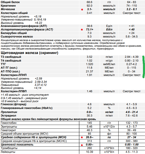 2. Щитовидка...как то ТТГ...но Т3 и Т4 в норме, так что возможно что этого ТТГ достаточно для правильной работы(мониторь щитовидку время от времени)