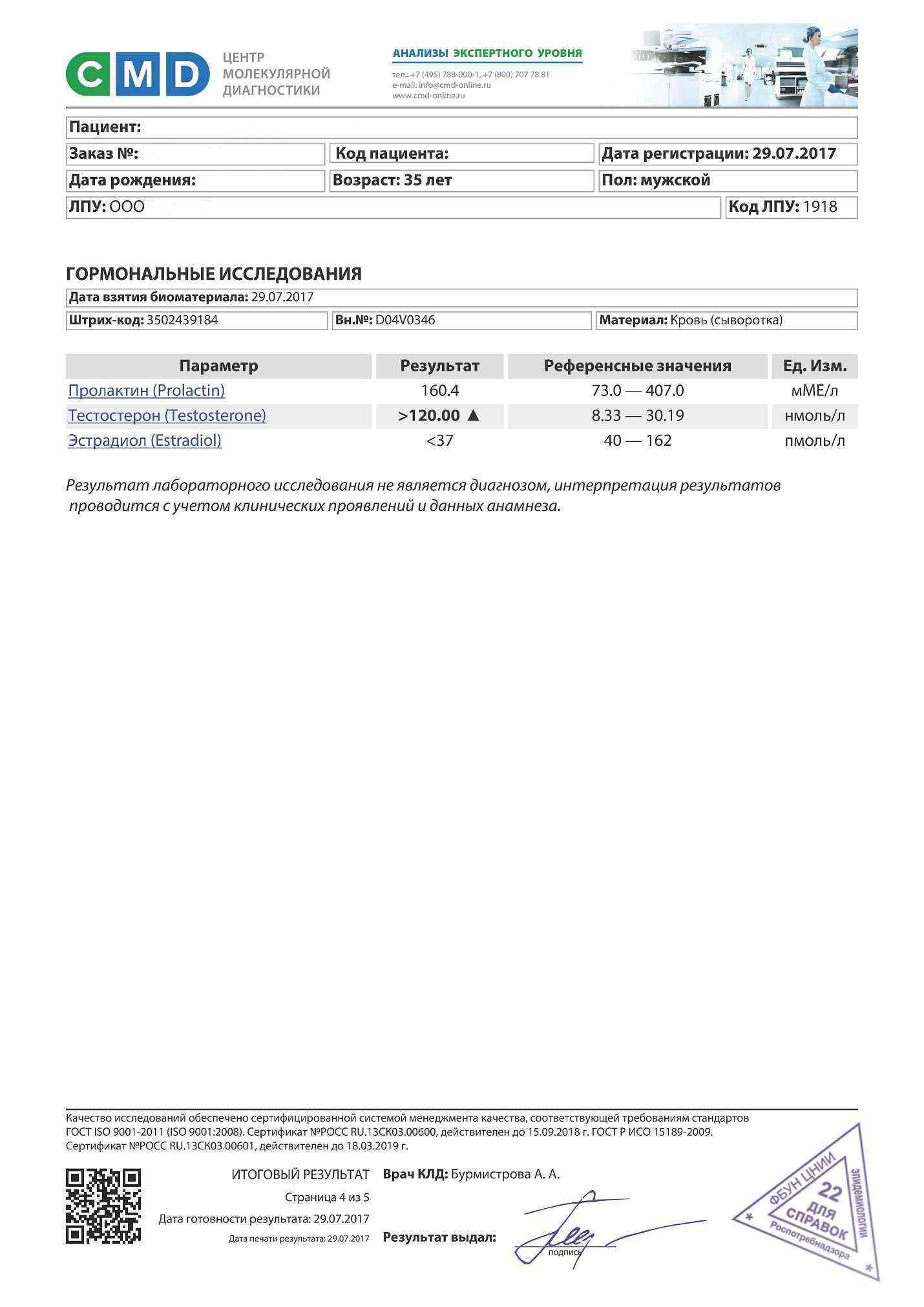 Сдал повторные анализы. Пятая неделя курса ТестЭ 250 + Туринабол 40. Эстрадиол и пролактин привел в референс.