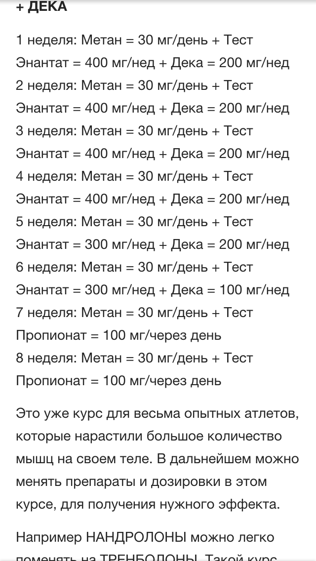 Я бы еще годиков до 25 подождал даже, успеешь перейти, плато выработай сначало)Всем привет. Хочу перейти на темную сторону. Задался вопросом из чего же будет состоять мой первый курс. Выбор пал на метан+дека+тест. Помогите составить грамотно пкт, и норм ли сам курс на ваш взгяд. Мне 22, рост 182, вес 70, сранный эктоморф)